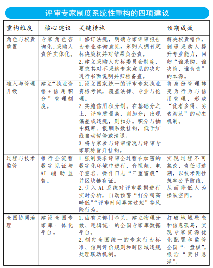 基于以上分析,未来的改革不应再是零敲碎打的制度“修补”,而应是一场深刻的制度“重塑”。笔者认为,应借助修法契机,对评审专家制度重新设计,具体建议如下表所示。