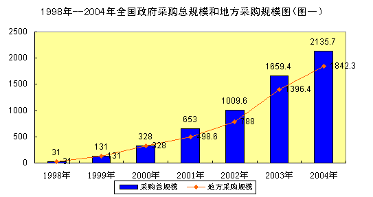 2004年全国政府采购规模达到2135.7亿元, 占当年财政支出的8%,比上年同比增长1.3个百分点;占当年GDP的2%,比上年同比增长0.6个百分点,6年来采购规模平均增长率达到88.8%。