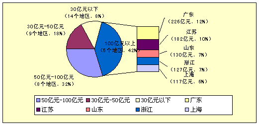 2004年地方采购规模为1842.3亿元,比上年增长32%,6年平均增长率达到124%。地方36个地区中,采购规模在100亿以上的地区有5个,采购规模在100亿和50亿之间的地区有8个,采购规模占地方采购总规模的32%。50亿元到30亿元之间的地区有9个,采购规模占地方采购总规模的18%。30亿元以下的地区有14个,采购规模占地方采购总规模的8%。