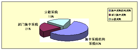 2004年全国集中采购机构采购规模为1270.3亿元,占采购总规模的59.5%,部门集中采购规模为457.2亿元,占采购总规模的21.4%,分散采购规模为408.2亿元,占采购总规模的19%。其中,中央集中采购机构采购规模为29.5亿元。