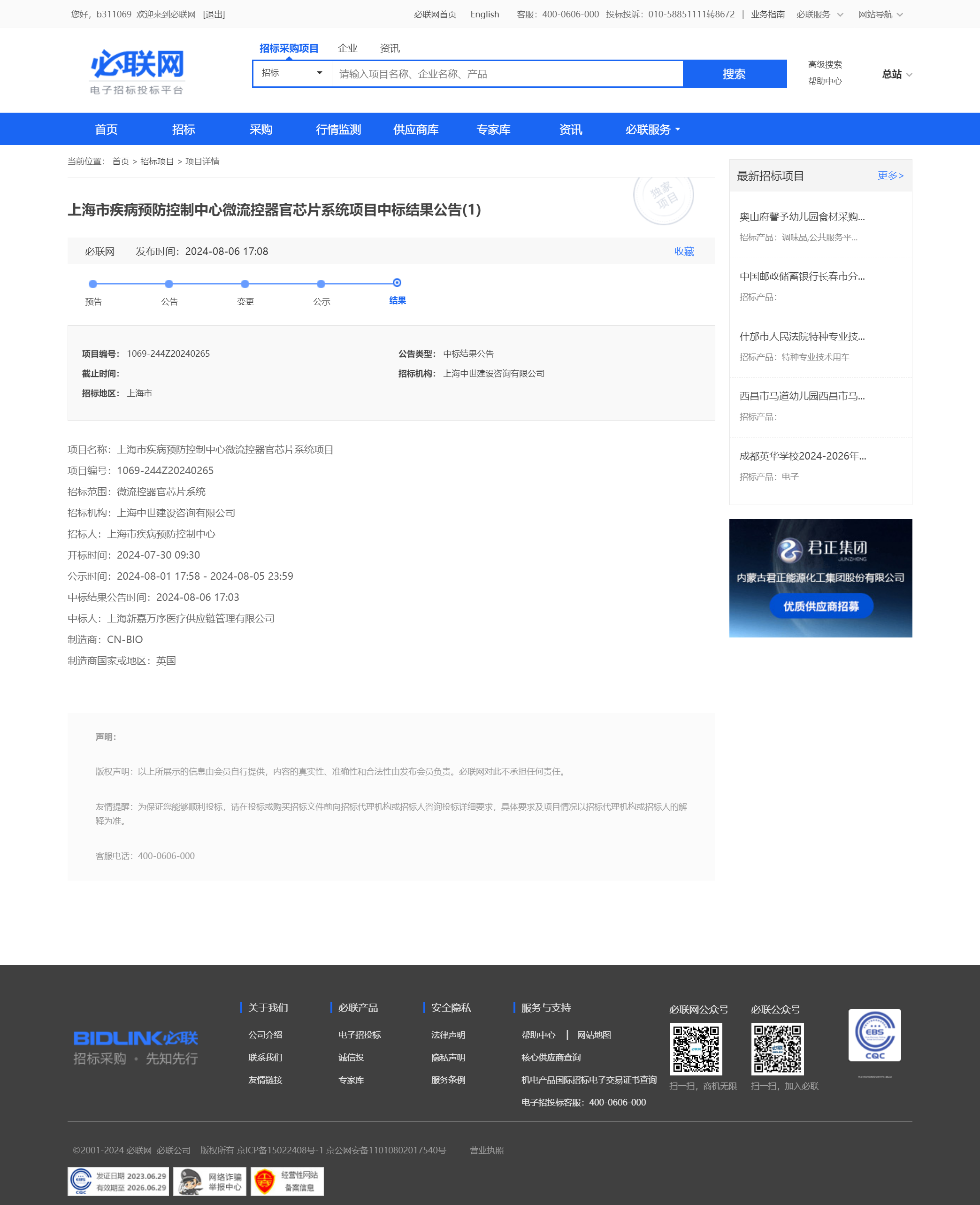 上海市疾病预防控制中心微流控器官芯片系统项目国际招标中标结果公告
