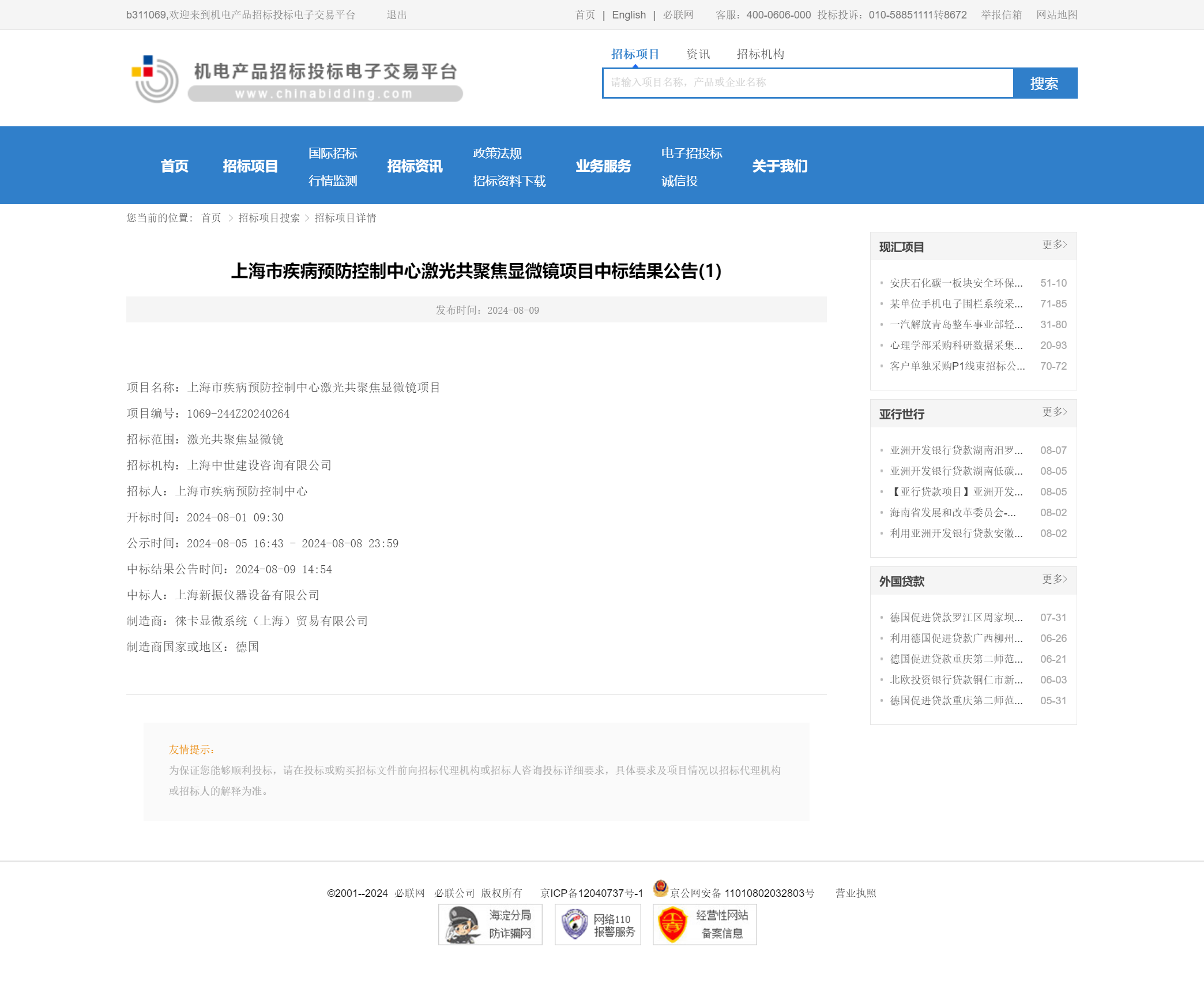 上海市疾病预防控制中心激光共聚焦显微镜项目国际招标中标结果公告