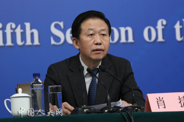 3月7日上午,十二届全国人大五次会议在梅地亚中心举行记者会,财政部部长肖捷、财政部部长助理戴柏华就“财政工作和财税改革”的相关问题回答中外记者的提问。图为财政部部长肖捷。中国人大网 罗荣 摄