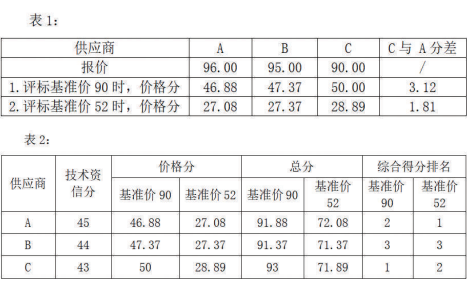 可以看出,当评标基准价由90万元变为52万元,综合得分的排名发生了变化,导致第一中标候选人改变。