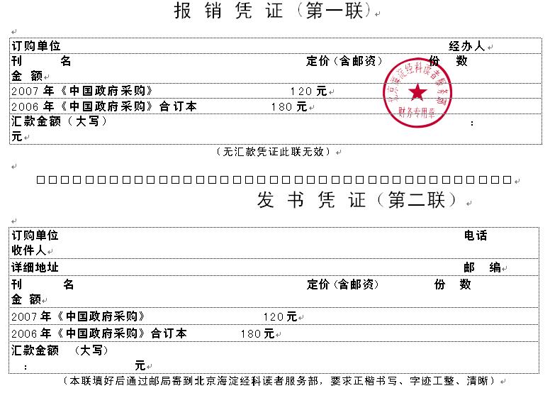 1. 通过银行信汇:请在信汇凭证“全称”栏写清单位全称,“用途”栏写清订购《中国政府采购》和份数。征订单第一联自留,可作报销凭证(无汇款凭证此联无效)。征订单第二联填好裁下,务必通过邮局寄到北京丰台邮局100071信箱13分箱北京海淀经科读者服务部,也可用传真将第二联传给010-62255586,不用再寄。