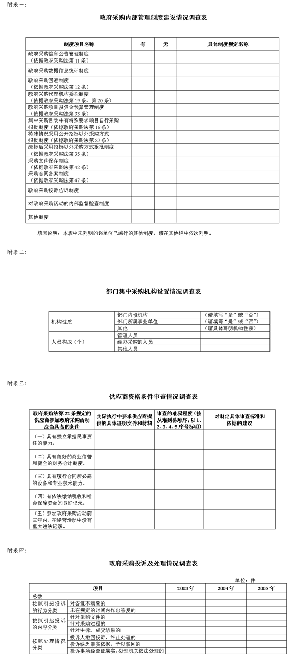 为了全面了解政府采购法律制度贯彻实施情况,对现行政府采购法律制度实施绩效和存在问题进行分析和评价,研究提出健全完善政府采购法律制度的意见和建议,为进一步做好相关立法工作提供决策依据和资料,我部拟就政府采购法律制度实施情况开展调研暨立法后评估,请你们协助开展调研评估工作。现将有关事宜函告如下: